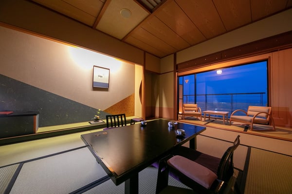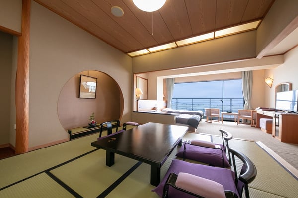 和洋室はツインベッドと8畳の和室がシームレスにつながる客室。定員が2〜5名なので夫婦やカップル、女子旅など幅広い宿泊スタイルに対応していますが、なかでも小さな子ども連れの家族旅行にはぴったり。畳の上で過ごす子どもに目を配りながら広縁で海を眺めてリラックスしたり、座卓に腰掛けて家族団らんの時間を過ごしたり、多彩な過ごし方が叶います。