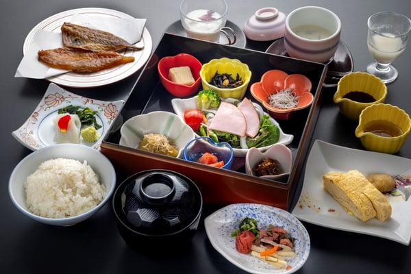 朝食は和定食スタイル。炊き立てのご飯、地元で水揚げされた魚の焼き物、出汁の効いた味噌汁、小鉢などが並び、シンプルながらも地元の味覚を満喫できます。海を望む朝の光の中で味わう一膳は、爽やかな一日のはじまりを演出してくれます。