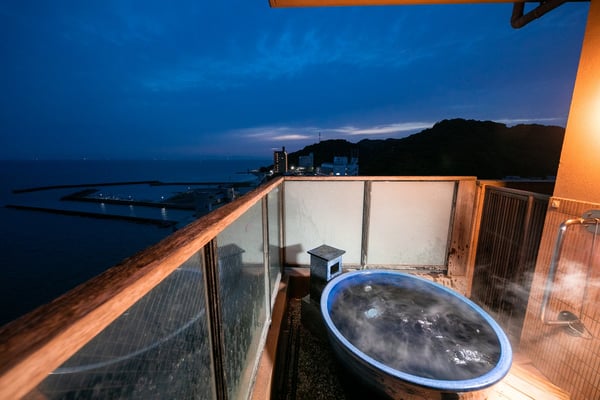 人気の露天風呂付き客室は4室限定。高層階の客室に備えられた専用の露天風呂に浸かりながら目の前の海を眺める専用露天で味わう時間は、まさに「源氏香」ならではの醍醐味。夜は満天の星、朝は爽やかな海風とともに湯浴みが楽しめるので、夫婦やカップルにおすすめです。