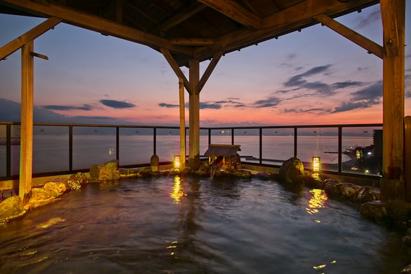 「源氏香」の温泉は「ナトリウム・カルシウム塩化物強塩泉」で、濃い塩分泉は保温効果が高く、湯上がり後もカラダがぽかぽかと温まるのが特徴です。最上階10階にある「雲上露天風呂」には、ヒノキ風呂や壺風呂、寝湯もある男性専用の「伊勢の湯」と、岩風呂とヒノキ風呂がある女性専用の「伏見の湯」の2つを備え、眼下に広がる伊勢湾の大パノラマを眺めながら湯浴みが楽しめるのが最大の魅力。温泉に浸かりながら夕陽に染まる海や満天の星空など眺め、ここでしか味わえない絶景体験を満喫しましょう。