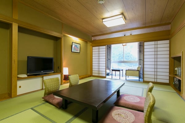 スタンダードな和室は、和室8畳と和室12畳の2タイプがあるタウンビューと和室12畳のリバービューの3タイプ。和室12畳のリバービューは2畳ほどの広縁が付いた最大定員5名の客室になっています。