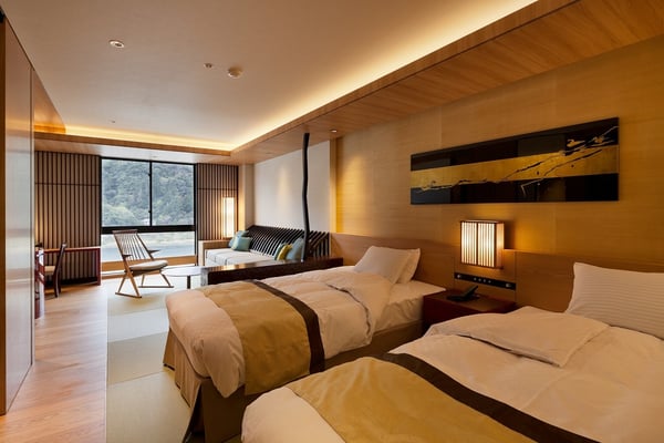 畳の上にベッドを配したリバービューの客室「プレミアムツイン」