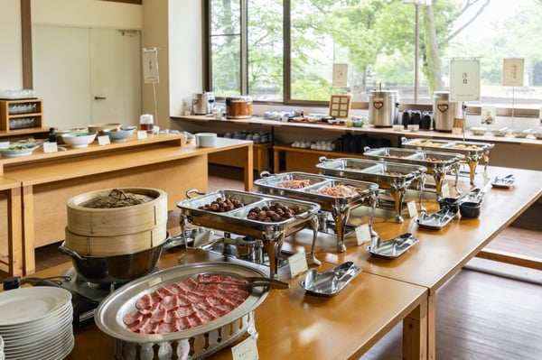 朝食は、朴葉みそや鮎雑炊などの郷土料理、焼き魚・煮物・だし巻きたまご・野菜のお浸しなど家庭的な和食料理のほか、ソーセージやベーコン、パンなど洋食も揃えた和洋バイキング。1階のレストラン「つぶらじい」はガラス張りの開放的な空間なので、四季折々の自然を眺めながら味わい、1日をスタートしましょう。