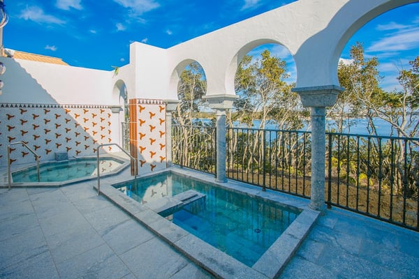 たとえば、アルハンブラゾーンにあるラグジュアリースイートは、ベッドルームとリビングが独立した空間。テラスからは英虞湾の絶景ビューが広がります。露天風呂のビューバスタイプもあるので、大切な人と地中海の旅を贅沢に体験したいカップルにぴったりです。