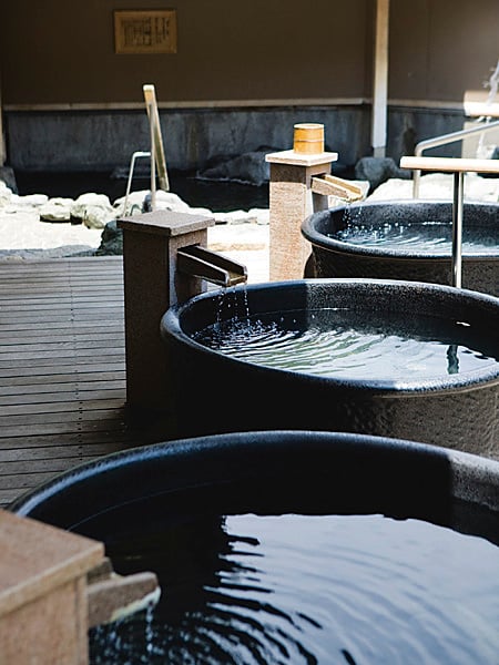 男性用の「外の宮」にも打たせ湯や岩造りの露天風呂、あつ湯の大桶風呂、ぬる湯の陶器風呂などがあります。男女ともに広くゆったりした内湯にはジャグジーやサウナがあるので、客室の露天風呂や温泉内風呂とは異なる魅力の大浴場で湯めぐりをしてみましょう。基本的にいつでも(清掃時間を除く)利用できます。