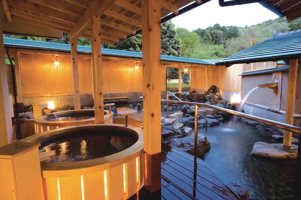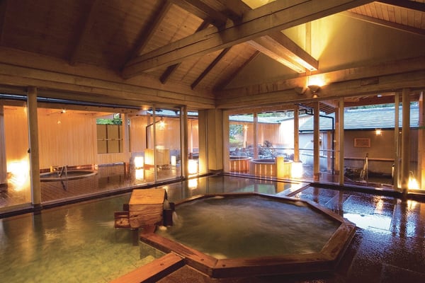 女性用の温泉大浴場「内の宮」には、打たせ湯がある露天風呂、岩に囲まれた露天風呂など趣が異なる露天風呂のほか、あつ湯とぬる湯がある大桶風呂などがあります。湯船に浸かってまわりを眺めていると、昼は自然光が差し込む明るく開放的な雰囲気で、ライトアップされた夜は月明かりが湯面にゆらぐ幻想的な世界へと変わるので、時間帯を変えながら何度も楽しめるのが魅力です。