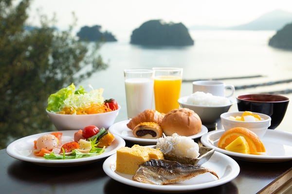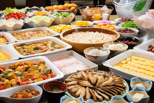 朝食バイキングは、地元の食材を使った惣菜や焼き魚、卵料理などの和食や焼きたてのパン、定番の洋食メニューなどが多彩に並びます。ヘルシーな料理が多いので、朝食でカラダをやさしく目覚めさせながら、新しい旅の1日をはじめましょう。大浴場は早朝から入浴ができるので、朝風呂でスッキリさせてから朝食を元気に味わうのもおすすめです。