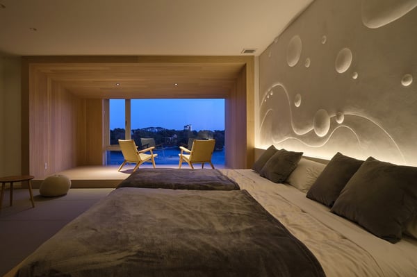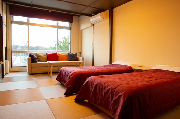 12畳の琉球畳の上に和ベッドを配した客室「朱の海」(一例)