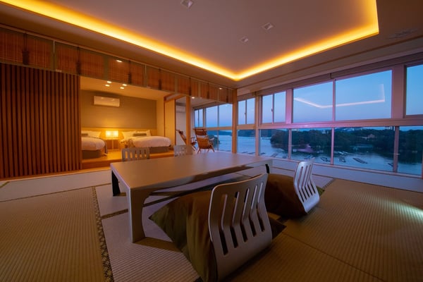 8階の最上階から鳥羽湾の眺望を独占できる桜フロアには、12畳和室にツインベッドがある特別室(最大6名)や和ベッドを置いた12畳の和室(最大2名)、布団を敷く12畳の和室(最大5名)があります。和ベッドの和室以外は、家族や女子旅などのグループでくつろいだ雰囲気のなかでおしゃべりをするなど楽しい時間が過ごせそうです。