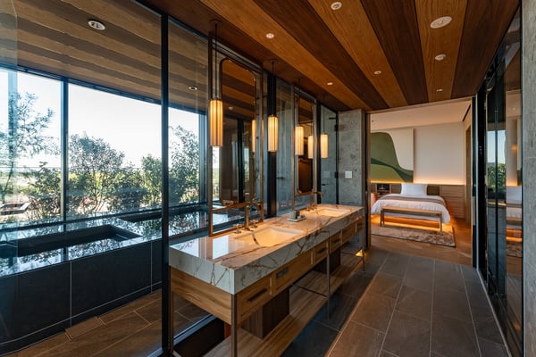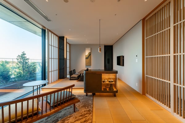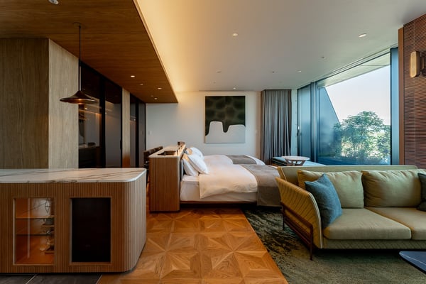 「リトリートスイート」(58.5㎡)は、ソファや照明などデザイン性の高い調度品を配したリビングや、源泉かけ流しのモール泉に浸かれる半露天風呂で、日常から離れ、大切な人と心穏やかな時間を過ごせます。長期滞在が可能な大きなクローゼットやデスクワークも可能な照明付きのカウンターテーブルも用意されているので、リトリートしながらのんびり過ごしてみるのもおすすめです。