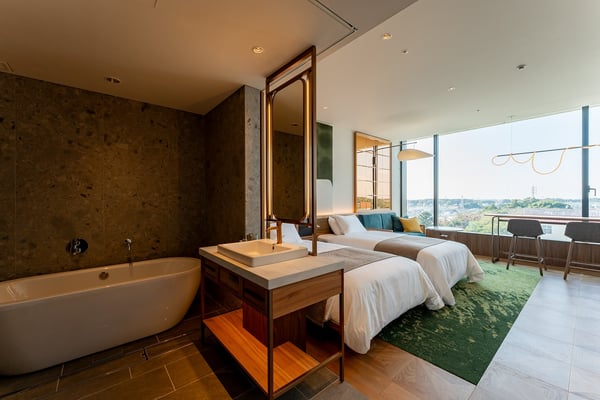 スタンダードに位置づけられる「プレミアツインA/B」(38㎡)は、セミダブルベッドを2台配置し、都市型ホテルでは感じることができないゆとりの空間設計を実現。ソファや照明、ラグ、壁のアートなど調度品は遠州の自然や文化を感じさせるデザインで統一され、バスルームには海外のリゾートのようなオシャレなバスタブを設置。リラックスと快適さを追求した室内で、くつろぎの時間が楽しめます。趣が異なる客室タイプが揃っているので、宿泊スタイルに合わせて選んでみましょう。