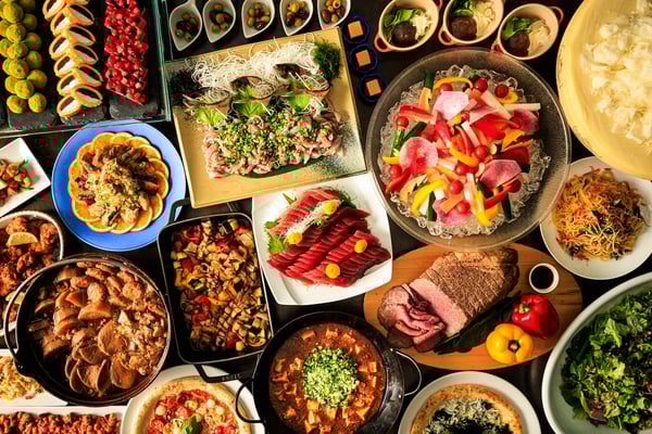 「熱海後楽園ホテル」の夕食は、宿泊プランにより和洋中ブッフェと会席料理のいずれかを選択。地元の新鮮な食材をふんだんに使用した料理の数々を堪能できます。レストラン「HARBOR’S W」(AQUA SQUARE2階)またはタワー館18階スカイレストラン「TOP OF ATAMI」で味わえる夕食ブッフェには、全60種類以上のメニューが並び、アルコール約25種&ソフトドリンクの「フリーフロー(飲み放題)」をセットにして提供。