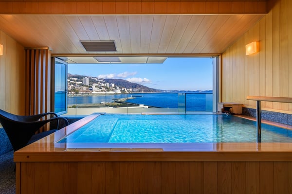 「熱海後楽園ホテル」の温泉は、敷地内の源泉を汲み上げたカルシウム・ナトリウム塩化物泉で、肌を包むような保温効果が特徴。タワー館5階の大展望風呂「海望(うみ)の湯」は、相模灘を真正面に望む開放的な造りで、露天風呂と内湯から大海原と熱海の夜景をパノラマのように望めます。95度の高温サウナもあります。
