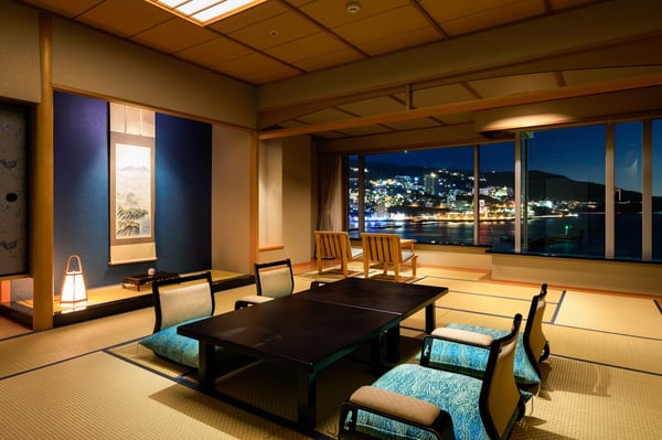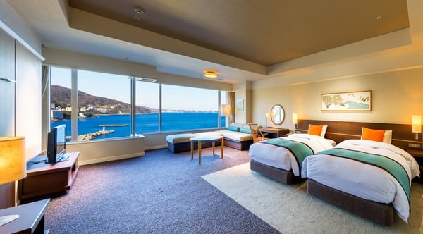 「熱海後楽園ホテル」の客室は、メイン宿泊棟のタワー館とAQUA SQUARE(アクア スクエア)に全189室を備えています。タワー館は、15〜17階のエクセレンシィフロアが和洋室、6〜14階のスタンダードフロアに和室・洋室・和洋室など、多彩なタイプが揃っています。