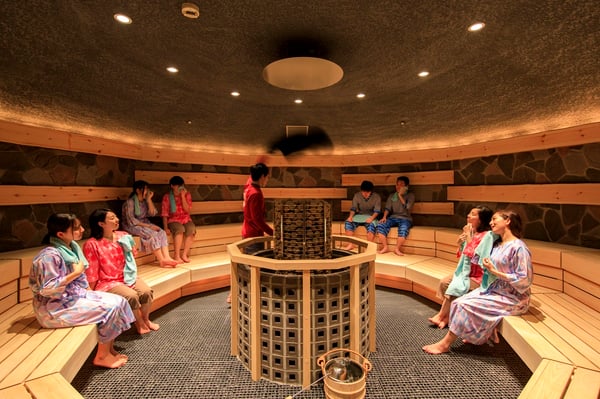 ほかにも、館内着を着たまま男女一緒にリラクゼーションができる温浴施設もあります。中央のサウナストーブを囲むように円形ベンチが配置され「ロウリュキャンプ」(要予約・無料)は、アロマ水をかけて蒸気を発生させ、スタッフ(熱波師)が大きなタオルで熱風を送る“アウフグース”スタイル。照明や温度、音の演出もあり、ユニークな発汗体験ができます。