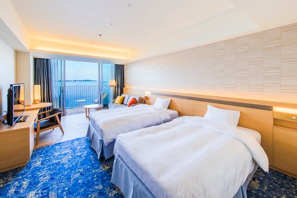 青い海や夜景を“絵画のように”切り取る窓辺が魅力の洋室は、カップルに最適。ウォールベッドとエキストラベッドを利用すれば最大5名まで宿泊できるので、機能的な客室でゆっくりしたい女子旅などのグループ利用にもおすすめです。