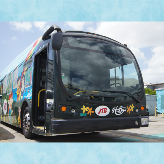 JTBハワイグループでは、オアフ島の大気汚染を軽減することを目的に、ハワイ州で初となる100%電動のバスを導入いたしました。排気ガス・騒音を出さず軽量で、フロアが低いため、子供や障害のある方々でも乗り降りがしやすいという特徴があります。