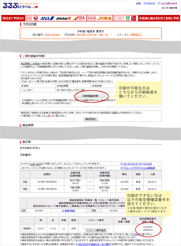 印刷ができない場合は以下の「航空券確認番号」を控えてください。