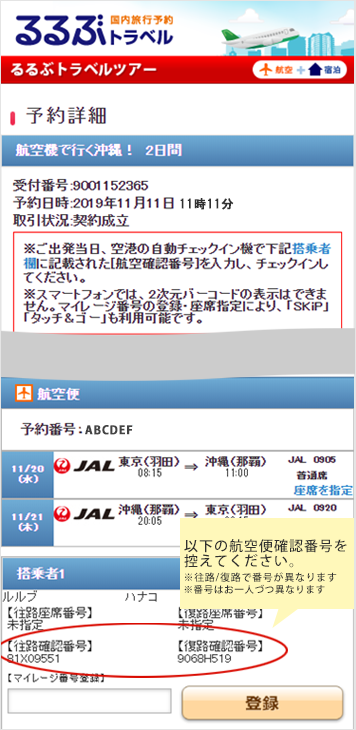 ※航空券確認番号は搭乗者お一人につき、往復一つずつ発行されます。他の搭乗者とお間違えにならないよう、また往路と復路をお間違えにならないようご注意ください。(乗継便にご搭乗の場合でも往復一つづつです)