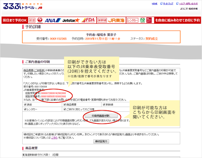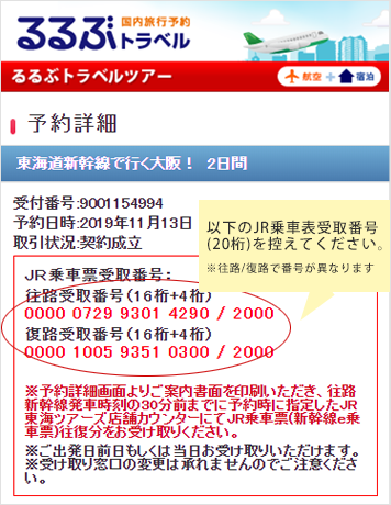 印刷ができない場合は以下の「JR乗車票受取番号 16桁+4桁」を控えてください。