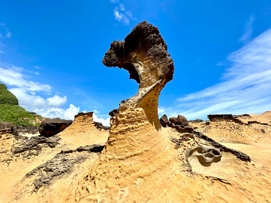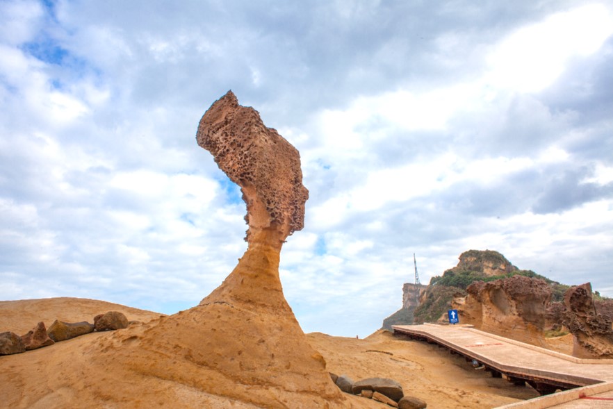 台北市内から「老梅緑石槽(グリーンリーフ)」へご案内する前に、同じく北海岸に位置する国際レベルの観光スポットと評される「野柳地質公園」での観光もお楽しみいただけます。野柳地質公園では、海水や波・風や雨などで浸蝕され、不思議な形をした岩や石がごろごろ♪♪ 中でも日々進む浸蝕でもう少しで見られなくなるかもしれない「クレオパトラ」の姿をした「女王頭」は必見です!