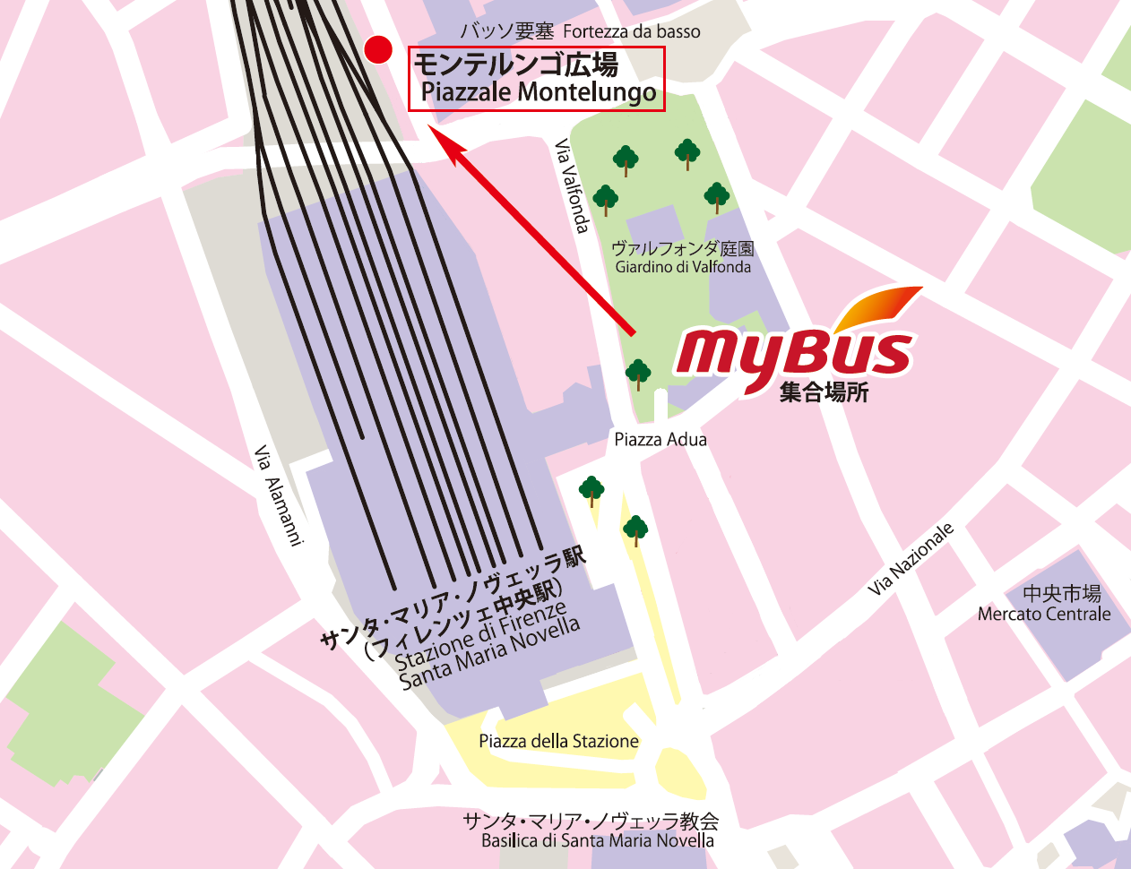 ※サンタ・マリア・ノヴェッラ駅横のスタツィオーネ広場から駅を左手に見ながら駅沿いにバッソ要塞方面へ進むと、徒歩約5分で道路沿いの大型バス発着場であるモンテルンゴ広場/Piazzale Montelungoに到着します。バス発着場にあるキオスク前にご集合ください。