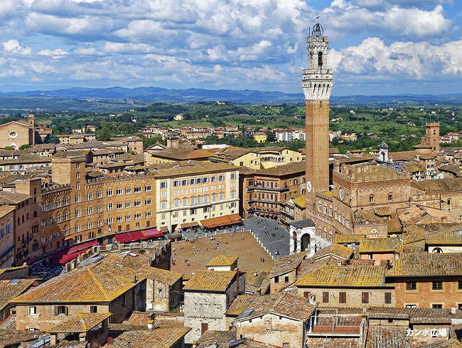 ◇シエナ(滞在約3時間55分) ◎世界一美しいカンポ広場やマンジャの塔を外観徒歩観光公認ガイドと市内観光(4~10月:約1時間、11~3月:約40分) その後ランチタイムを含むフリータイム |