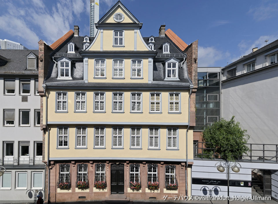 徒歩または公共交通機関にて出発 ●ゲーテハウス ◎レーマー広場 ●ドーム ◎マイン川(アイゼナー小橋、歩行者専用) ◎カタリーネン教会 ◎ハウプトバッへ ◎証券取引所 ◎旧オペラ座 ◎ゲーテどおり |