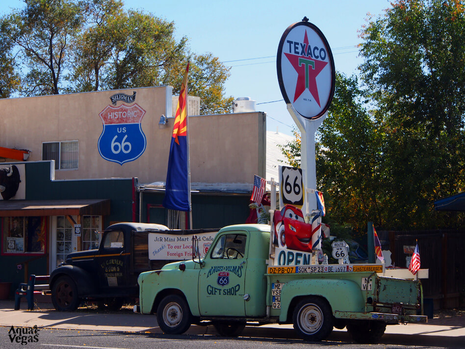ルート66 サインで写真撮影 ※途中下車し、ロードサインで写真撮影 6大絶景⑥ルート66の町セリグマンで休憩 (約20分) 〜旅の終わりはルート66︕「ルート66」はディズニー/ピクサー映画「CARS」で有名ですが、アメリカの北はシカゴから南はロサンゼルスまで続く約90年以上も続く歴史的な道路。 ノスタルジックなクラシックカーやネオンサインを背景に旅路が終わりに近づきます〜 途中で休憩 |