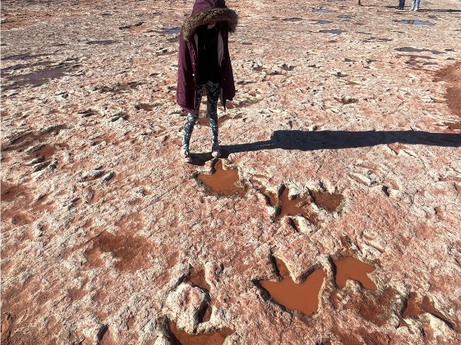6大絶景④**夏季と冬季で異なります <<夏季>>モエべ ダイナソートラック見学 (写真撮影約10分) ~大小さまざまな恐竜の足跡化石を発見!?~ <<冬期>>ペインティットデザートでの写真撮影 ~三畳紀前期のチンル層で鉱物が含まれる色々な色が付いた地層が広がっています~ |