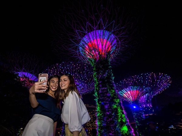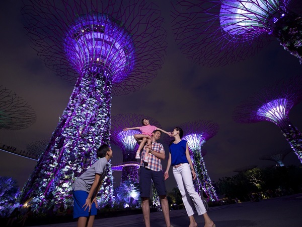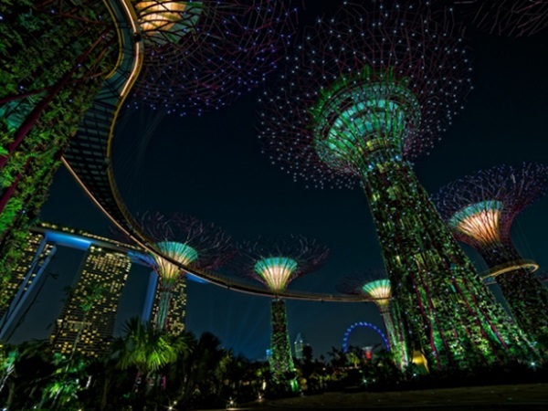巨大なスーパーツリーが音楽にあわせて光るショー「ガーデン・ラプソディ」はシンガポールの夜景に華を添える名物イベント。