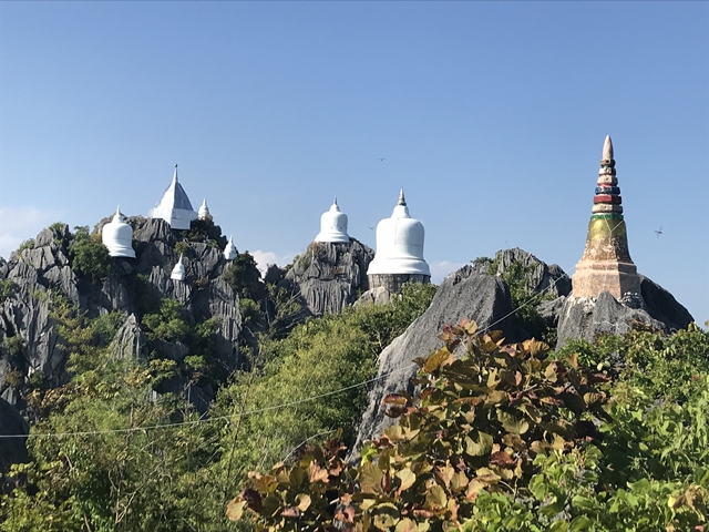 断崖絶壁の山にチェディが点在する絶景を求めて、多くの人々が訪れるランパーン県の「ワット・プラプッタバート・スッターワート」。