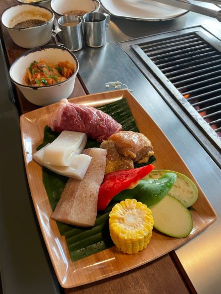 | 料金に含まれるサービス | <ミックスグリル(A)> 味付けNYストリップロインステーキ、マヒマヒのハーブガーリックマリネ、チキンショウガ醤油マリネ、イカリング、ナス、ピーマン、コーン <キッズメニュー(子供 6~11歳)> チキンマリネ、ビーフソーセージ、バターキャロット&コーン <すべてのセットに含まれる食べ放題メニュー> ライス、フライドライス、そば、そうめん、ポン酢、ごましゃぶのたれ、味噌汁、豆腐、わかめ、長ネギ、フライドガーリック、エシャロット、キムチ、サラダバー、トロピカルフルーツスライス、バニラソフトクリーム 生ビール、ソーダ、アイスティーの飲み放題 |
