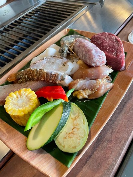 | 料金に含まれるサービス | <ステーキ&ロブスター(C)> 味付けビーフテンダーロイン、タイガーシュリンプ、スモークソーセージ、ロブスターテール&ガーリックバター、マヒマヒのハーブガーリックマリネ、ハーフシェルオイスター、チキンショウガ醤油マリネ、イカリング、ナス、ピーマン、コーン <キッズメニュー(子供 6~11歳)> チキンマリネ、ビーフソーセージ、バターキャロット&コーン <すべてのセットに含まれる食べ放題メニュー> ライス、フライドライス、そば、そうめん、ポン酢、ごましゃぶのたれ、味噌汁、豆腐、わかめ、長ネギ、フライドガーリック、エシャロット、キムチ、サラダバー、トロピカルフルーツスライス、バニラソフトクリーム 生ビール、ソーダ、アイスティーの飲み放題 |