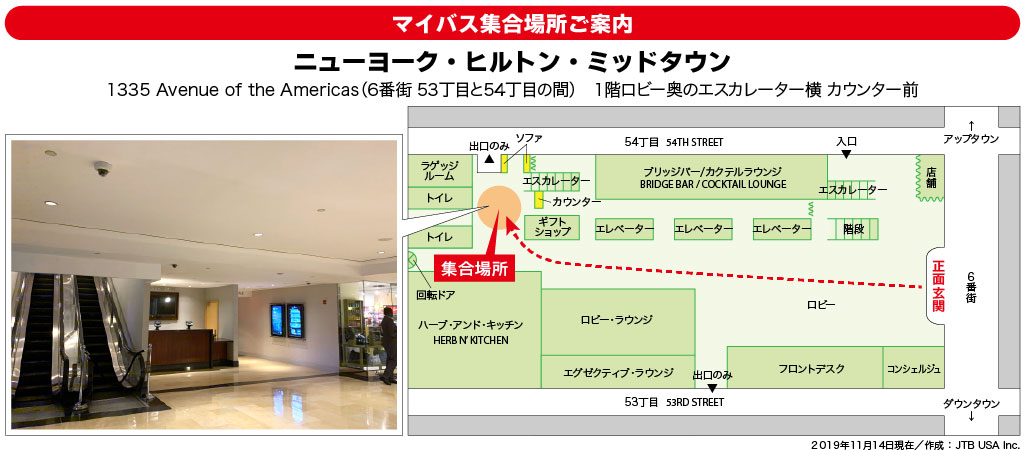 ニューヨークヒルトンミッドタウン ホテル内、1階ロビー奥のエスカレーター横・カウンター前 ■住所:1335 AVENUE OF THE AMERICAS (6番街 53丁目と54丁目の間) (集合時間は試合開始時間によって異なりますが、開始約2~3時間前集合の予定です。) |