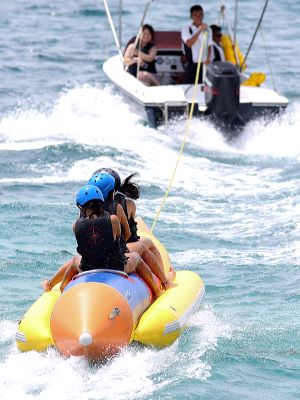 バナナボート マリンスポーツの定番、バナナボートを満喫!ゴムボートに乗って海の上をパワーボートに引かれながら疾走します。 振り落とされないようにするためにバランス力も必要です。 子供から大人まで楽しめますので、少人数でも大人数でもOKです♪ 《注意》 ※妊娠中、アルコール摂取のお客様のご参加はご遠慮いただいております。 ※天候により催行中止となる場合がございます。 |
