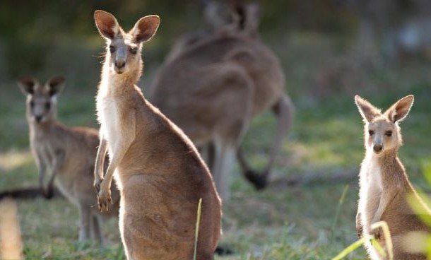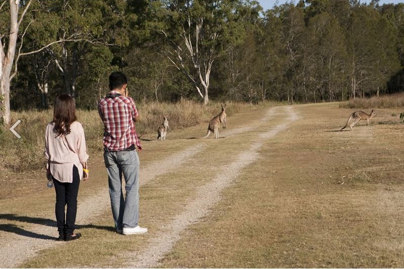 ゴールドコースト自然保護区訪問 *野生動物探検とブッシュウォーク 野生のカンガルーが飛び跳ねる姿や、コアラが樹上で休む姿を探します |