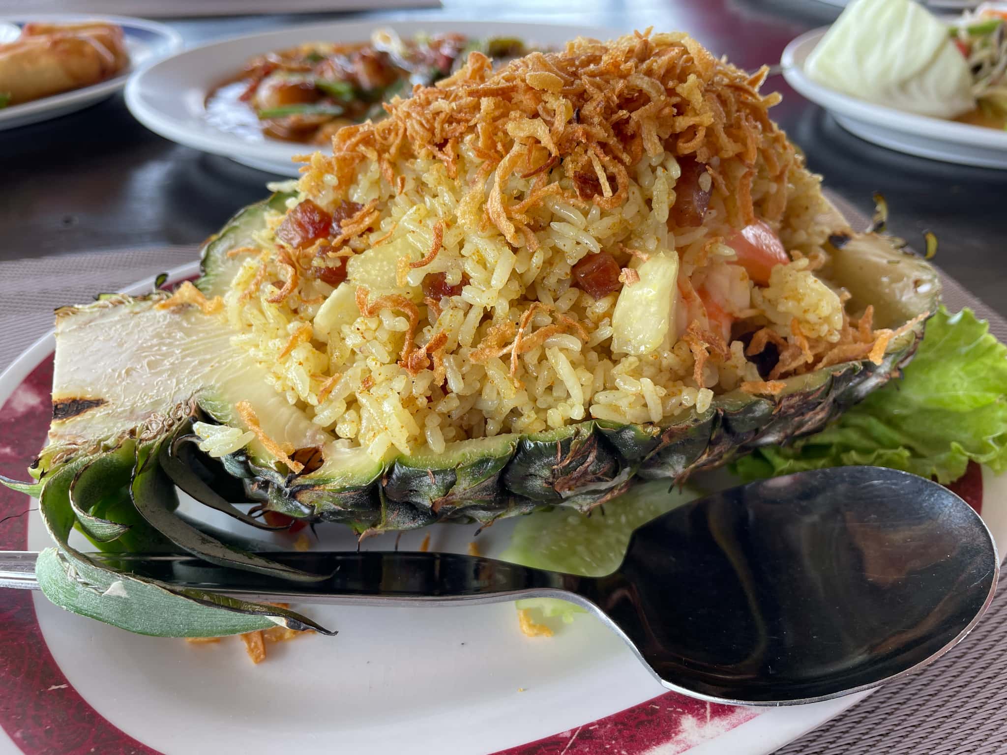 シーフードレストラン・チャオレーにて昼食 ホアヒンの美しい海を眺めながらタイ料理をお楽しみください。メニュー:パイナップルライス(エビ入り)、エビ春巻き、アサリと野菜のチリ炒めです。※内容は予告なく変更となる場合がございます。予めご了承ください。 |