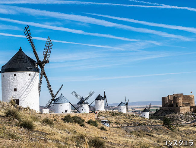 コンスエグラ(Consuegra)は、、特に「ドン・キホーテ」の風車で有名な観光地です。ドン・キホーテが風車を「巨人」と見間違えたという有名な場面を彷彿とさせる、幻想的な風景をお楽しみ下さい。