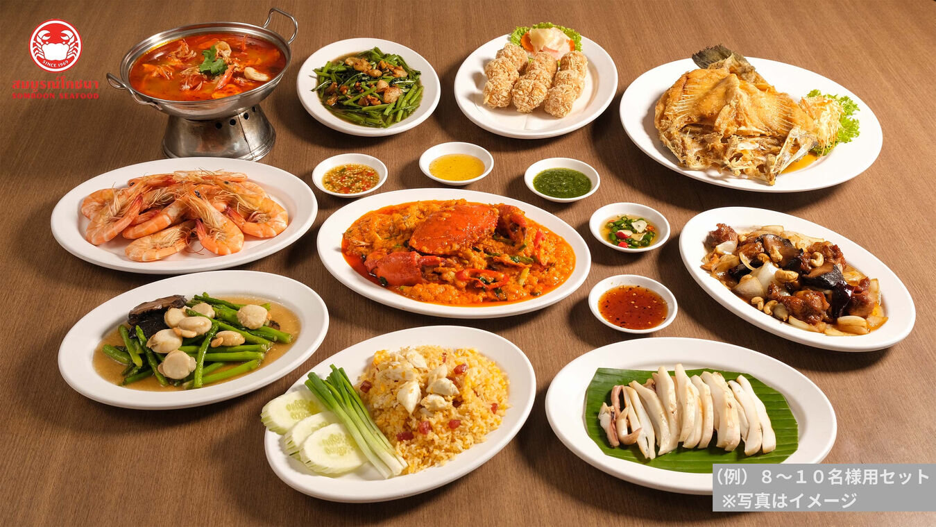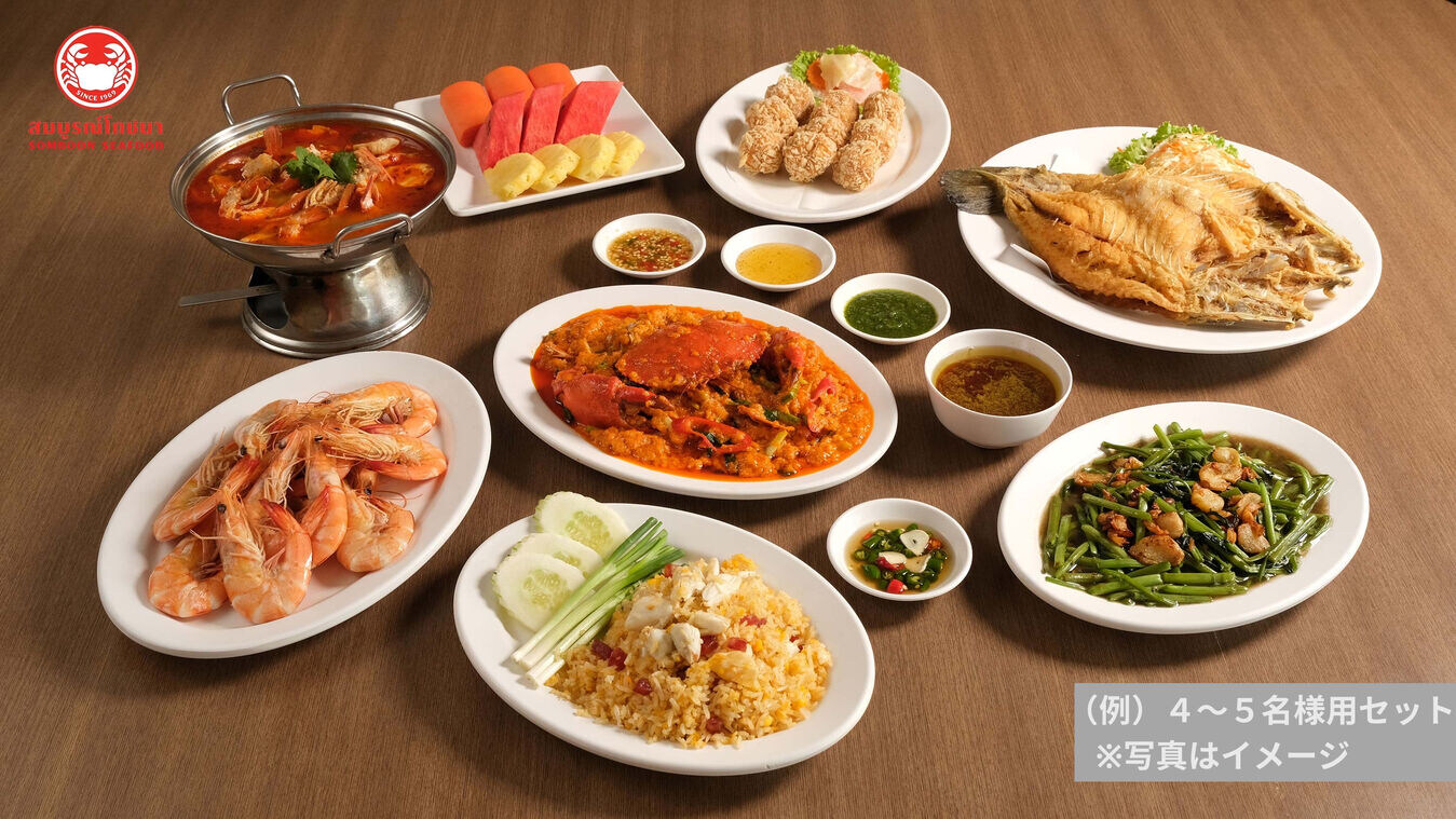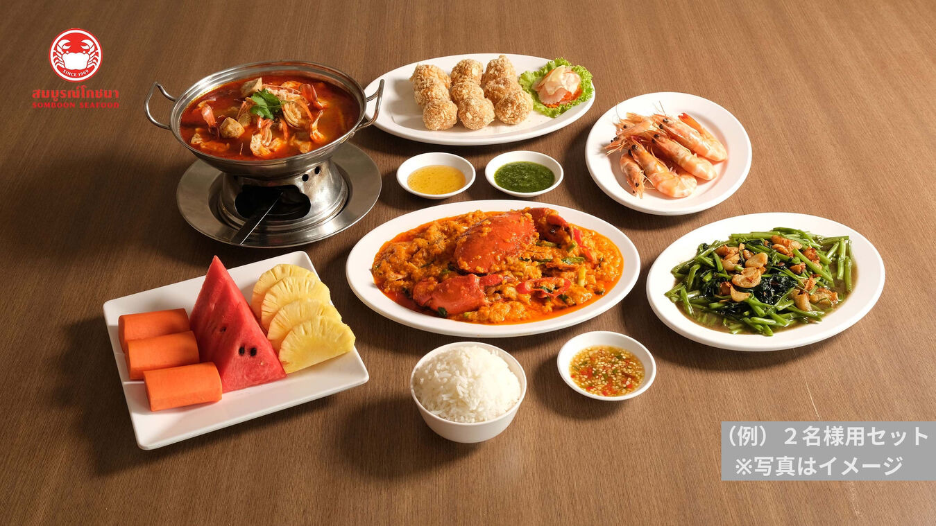<メニュー例> ▼2名用セット 蟹カレー、空芯菜炒め、トムヤムクン、エビボール揚げ、エビの塩焼き、ライス、季節のフルーツ 3名以上でお申込みの場合、以下のお料理が追加となります。 ▼3名:揚げシーバスと甘い魚醤添え ▼4~5名:揚げシーバスと甘い魚醤添え、蟹炒飯 ▼6~7名:揚げシーバスと甘い魚醤添え、帆立とアスパラガス炒め、蟹炒飯 ▼8~10名:揚げシーバスと甘い魚醤添え、チキンのカシューナッツ炒め、帆立とアスパラガス炒め、焼きイカ、蟹炒飯 ※ 店舗の都合により、事前の予告なくメニューの一部が変更となる場合があります。 |