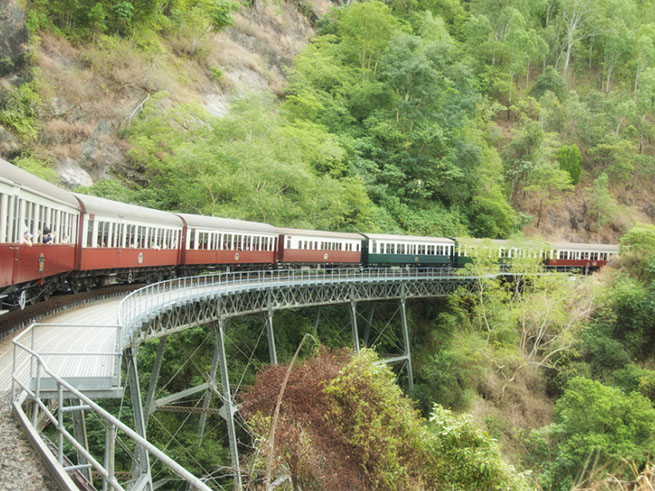 空からはスカイレールで熱帯雨林の絶景を楽しみ、陸ではキュランダ鉄道で滝や渓谷の美しい車窓を満喫🌳