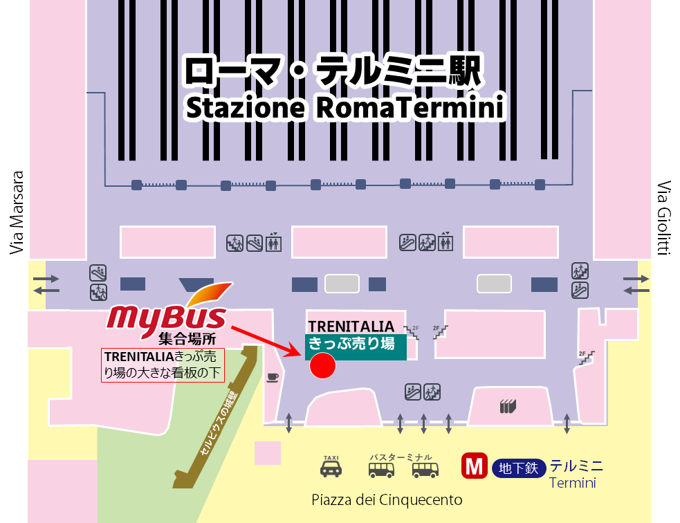 バスターミナルのチンクエチェント広場を背にしてテルミニ駅構内左手にある、ガラス張りのTRENITALIAのチケット売り場TRENITALIAのロゴの下にご集合ください。