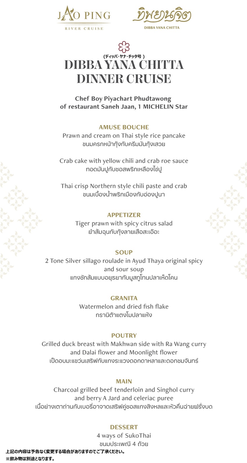 ◎ ミシュランの星を獲得したシェフ、ピヤチャート・プッタワン氏が監修した7コースのタイ料理セットをご用意