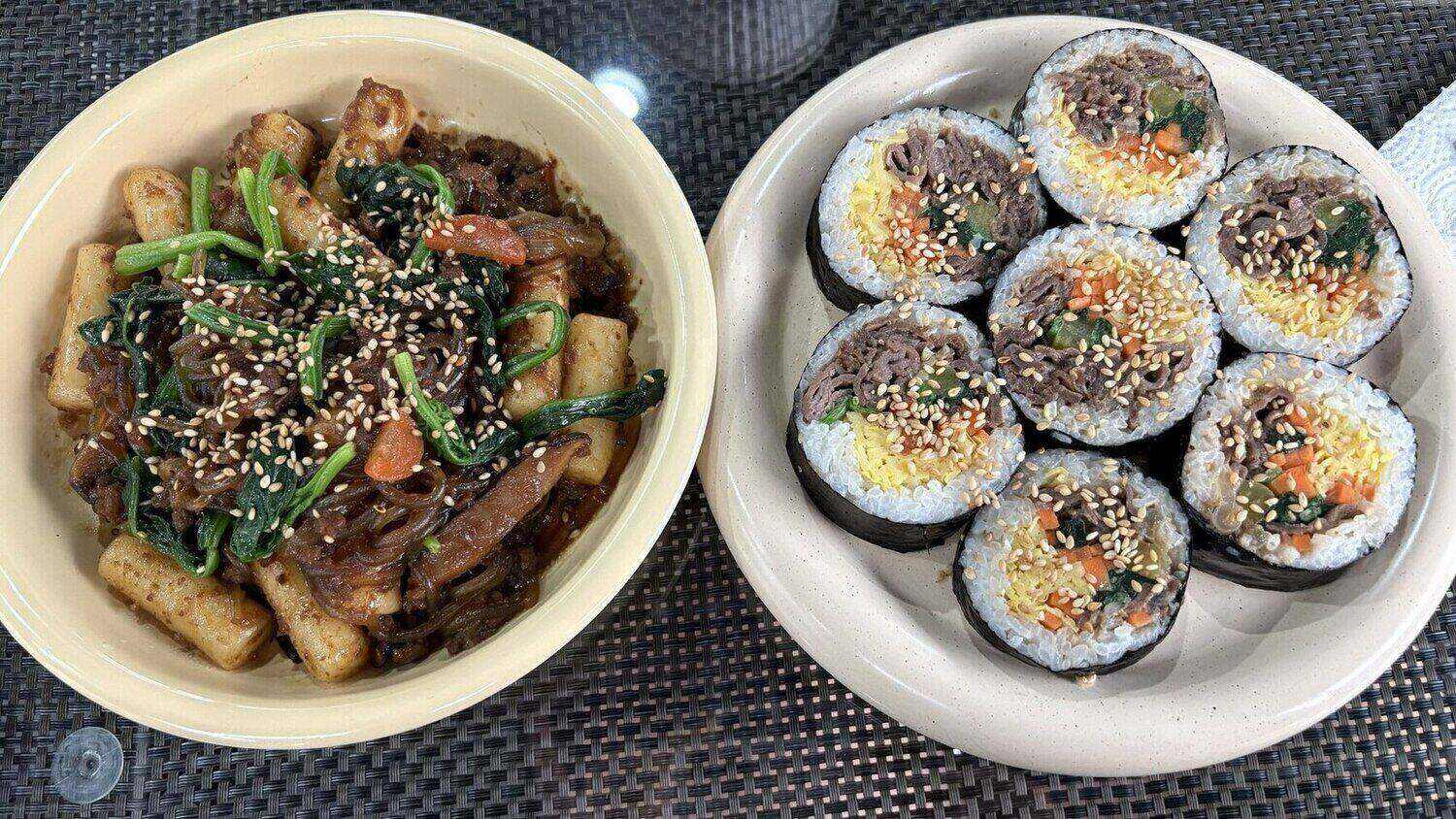 【メニュー⑨】 熟成キムチのキンパ(じゅくせいきむちのきんぱ) &キムチそば粉のチヂミ巻き(きむちそばこのちぢみまき) ・アレルギー誘発情報:卵、ごま油(ごま)、大豆、そば、小麦、大豆 |
