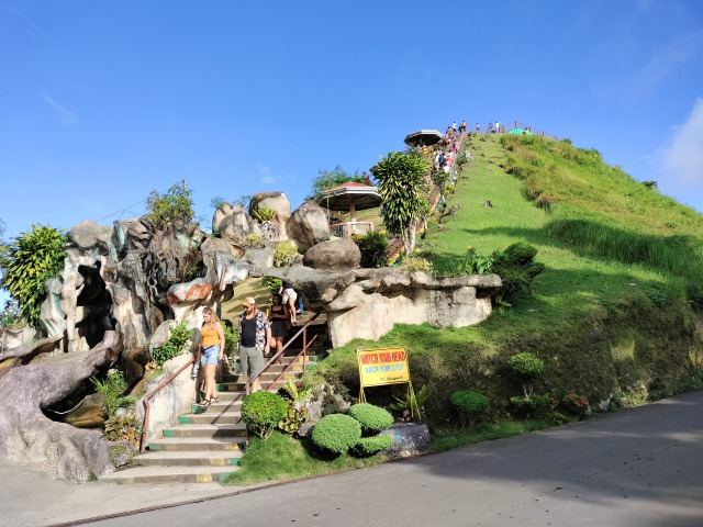 チョコレートヒルズ(下車) 1,268個の円錐型の山が並び、幻想的な光景が広がります。山の高さは20mから140m程度まで様々です。5月の乾季になると山の草が枯れ、茶色に変わるため、この地はチョコレートヒルズと呼ばれています。 (※展望台までの道のりには約200段の階段があります。) |