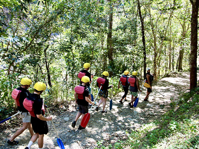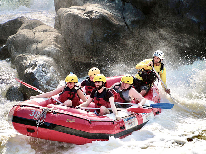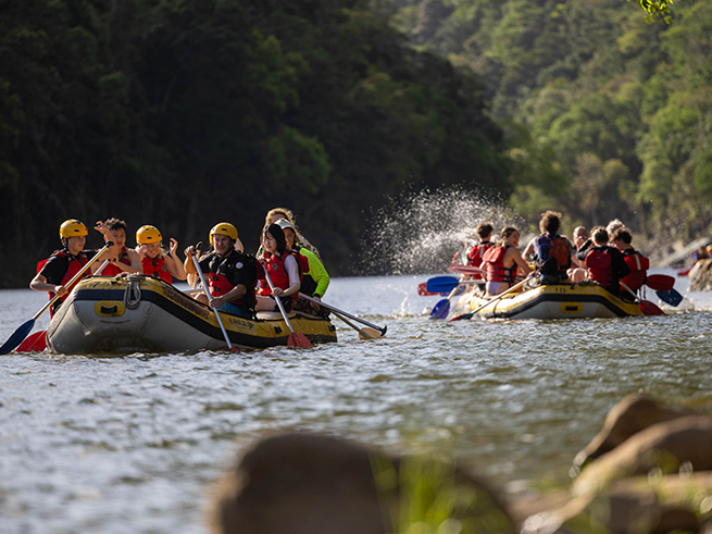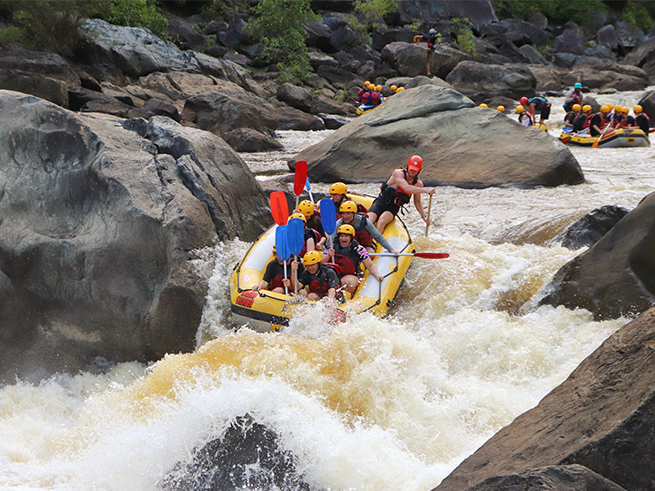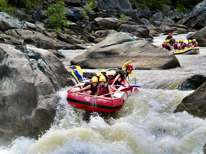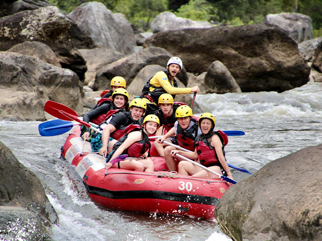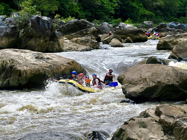 穏やかな流れのエリアでは熱帯雨林の美しい景色を楽しみながら進み、迫力ある急流ポイントでは仲間と協力してパドルを漕ぎながらスリル満点の体験を味わえます🤩