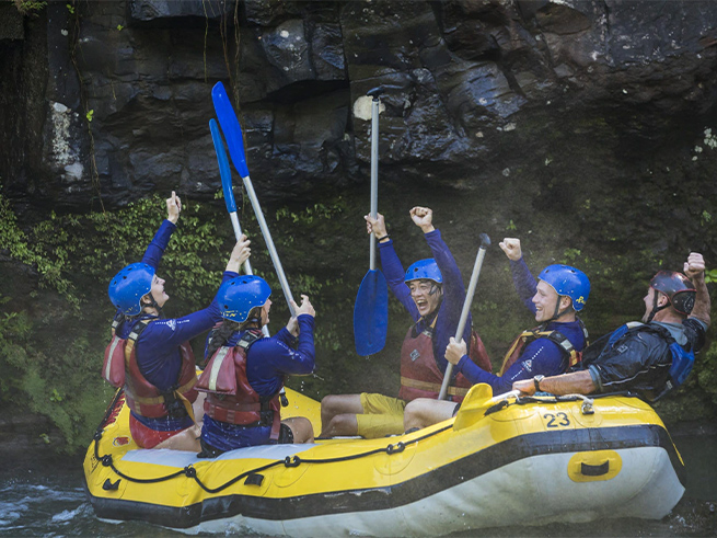 ヘルメットやライフジャケットを装着し、チームで力を合わせながらボートを操作してスリル満点の急流を下っていきます🤩