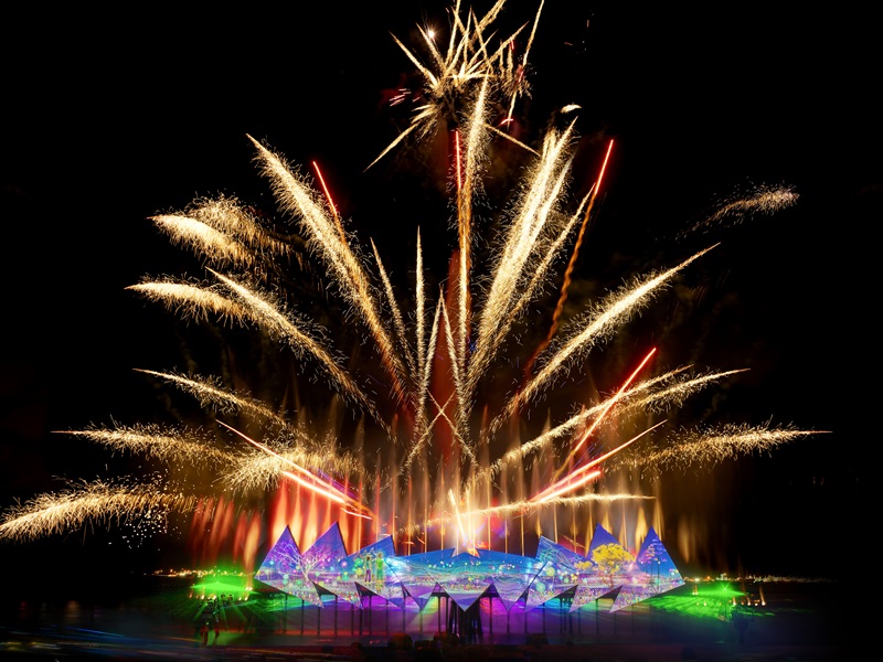 大量の水を噴出して霧状のスクリーンを作り、そこにCG映像を投影したこどもたちや鳥の姿は、まるで夜空に浮かんでいるよう。感動のフィナーレでは花火も上がり、子供から大人まで楽しめますよ!