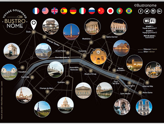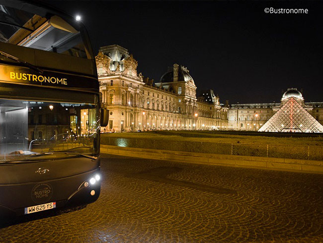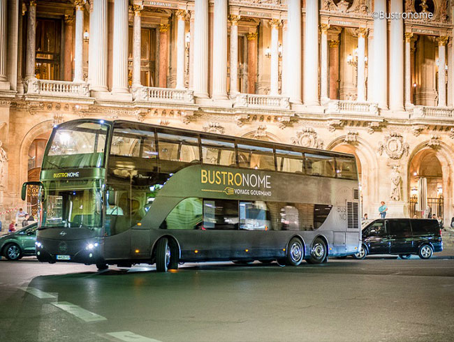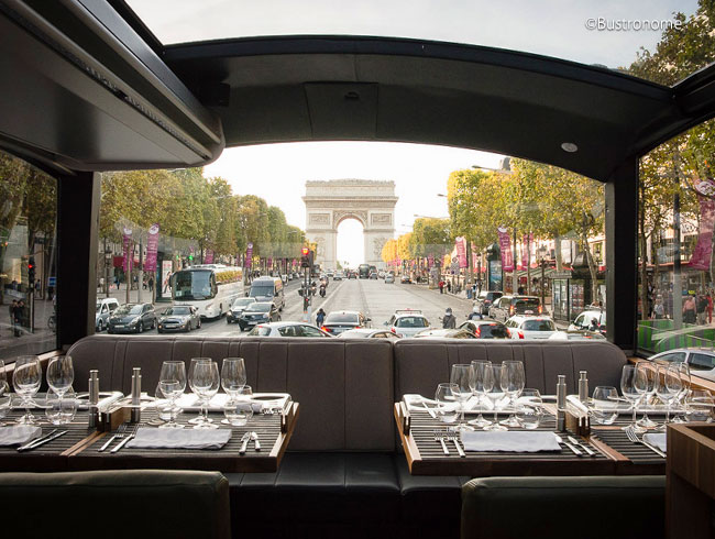 天井も側面もガラス張りの二階建てバスでパリの観光名所を巡りながら、フランス料理をお楽しみください。