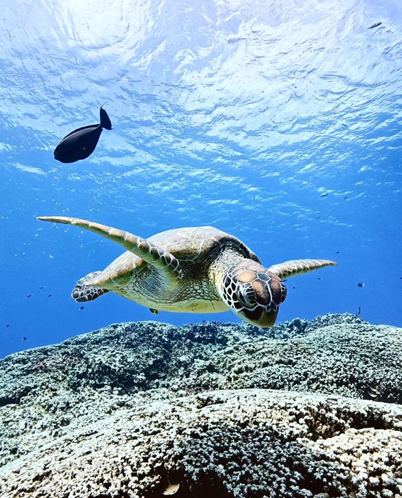 ボートに乗って高確率で「ウミガメ」に出会えるスポットでスノーケリング!水槽の中とはひと味違うアクティブなウミガメたちとの出会いをお楽しみください。